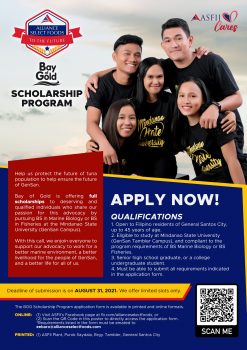 Bay of Gold is offering full scholarships to deserving and qualified individuals who share their passion for this advocacy by pursuing BS in Marine Biology or BS in Fisheries at the Mindanao State University (GenSan Campus).