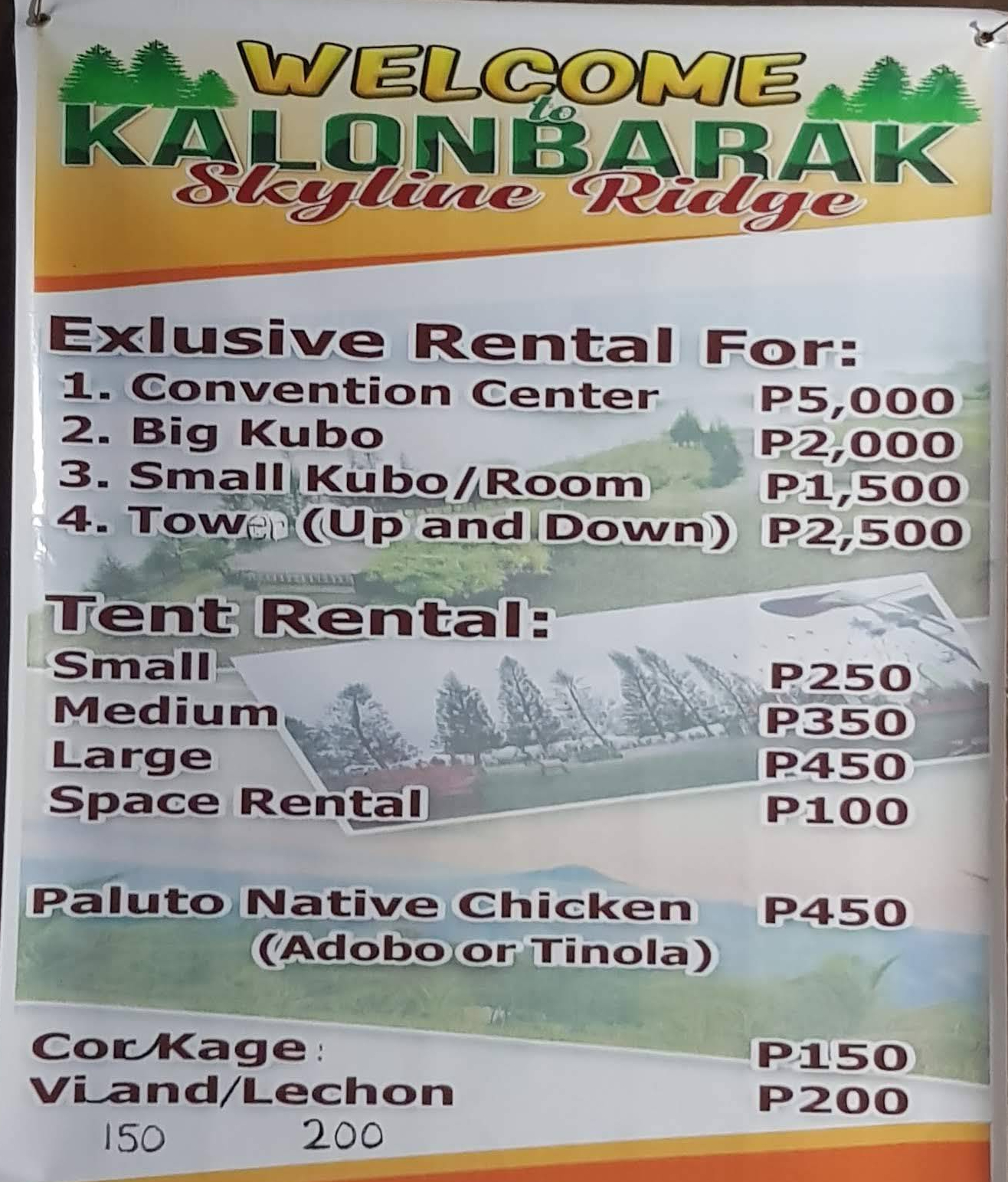 Here are the complete rates of the rents, cottages and rooms available. Included here are the corkage rates of food brought into the camp from outside and the price of an order of Adobo or Tinolang Native Chicken.