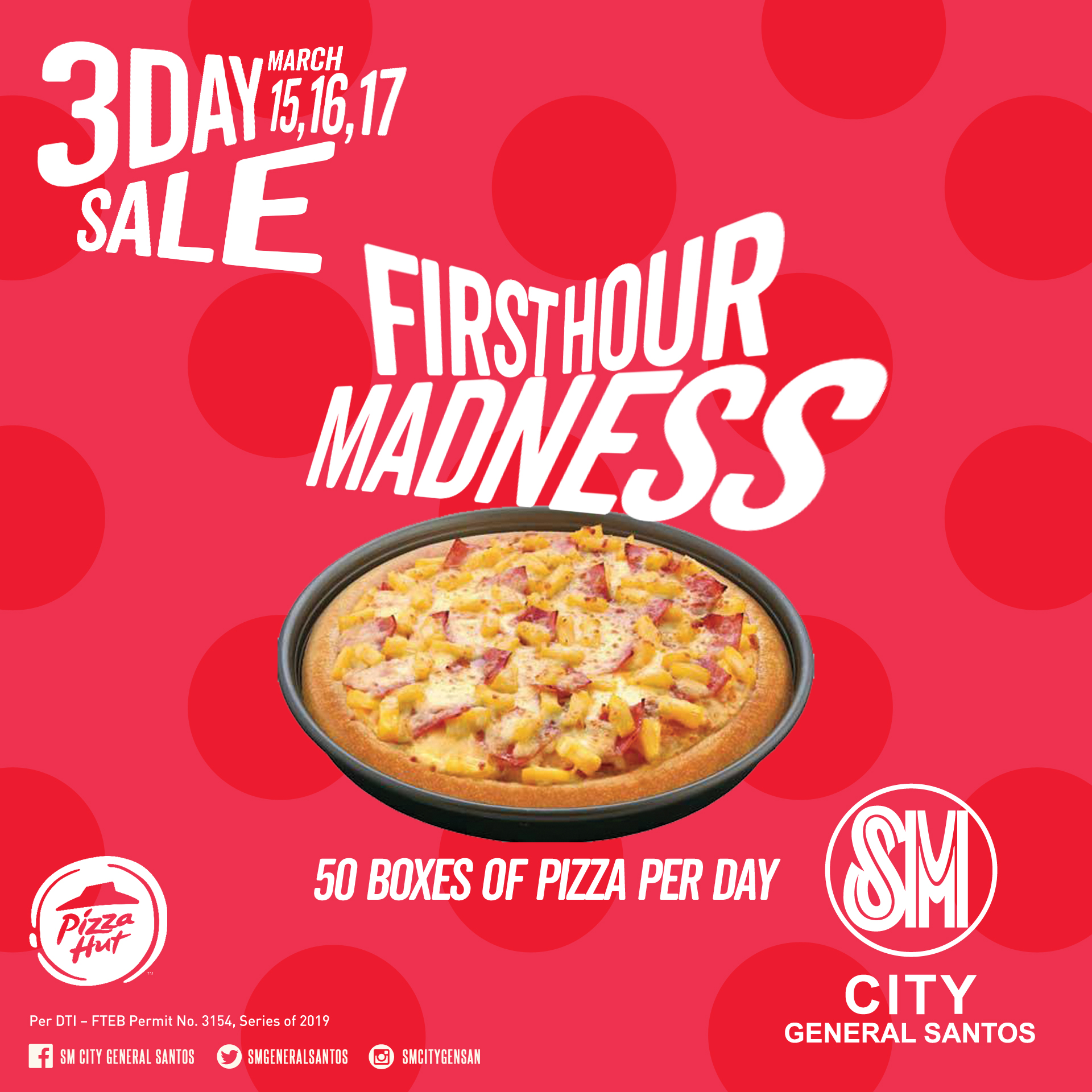 - The first 50 shoppers daily on March 15-17, to present a minimum of P1,000 single receipt on date purchase from 10AM-12NN will get a box of pizza from Pizza Hut