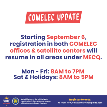It was also announced by COMELEC today that starting September 6, 2021, registration in both COMELEC offices and satellite registration centers will resume in all areas under Modified Enhanced Community Quarantine with hours from Monday to Friday, 8 a.m. to 7 p.m. and Saturdays and holidays, 8 a.m. to 5 p.m.