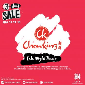 For a minimum of P1,000 single-receipt purchase made within March 13-15, 2020 from any participating establishment at SM City Gensan, a shopper gets a chance to claim ONE (1) PEARL MILK TEA FROM CHOWKING Late Night Treats.