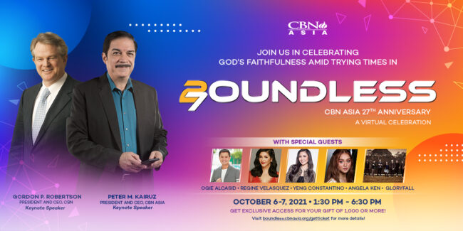 On October 6 and 7, from 1:30 PM to 6:30 PM, join a virtual event dubbed Boundless to commemorate 27 years of God’s boundless love and commitment to CBN Asia.